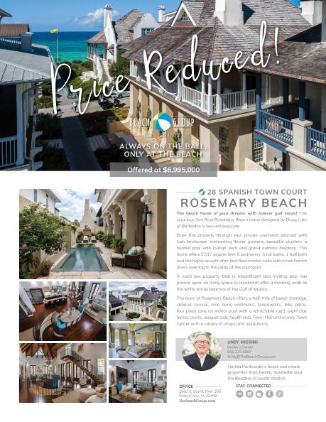2563 S. Scenic Hwy 395 WaterColor, FL 32459 850.231.9007 TheBeachGroup.com Offered at $7,195,000 | MLS#847767 PRSRT STD US Postage PAID Endpoint Direct Luxury Beach Living ANDY WIGGINS Broker Owner 850.225.8887 Andy@TheBeachGroup.com NOW IS TIME TO LIST YOUR HOME! Trust the 30-A Real Estate Experts! The town of Rosemary Beach offers half mile of beach frontage, cabana service, nine dune walkovers, boardwalks, bike paths, four pools (one an indoor pool with a retractable roof), eight clay tennis courts, racquet club, health club, Town Hall and lively Town Center with variety of shops and restaurants. 28 W. SPANISH TOWN COURT ROSEMARY BEACH • Immediately next to Beach Access • Subzero, Wolf and Miele Appliances • 3000+ SF of balcony’s and porches • Designed by Doug Luke of Barbados • Beautiful courtyard with a Heated Pool, Waterfall and Grand Outdoor Fireplace • Venician plaster accent walls 5,017 Square Feet 5 Bedrooms 5 Full and 1 Half Bath 2 car garage Carriage house Forever Gulf Views New Interior Paint 2nd Row Rosemary Beach TheBeachGroup.com STAY CONNECTED Single Property Feature - Just Listed/Coming Soon/Price Reduced *Agent Specific 6 Property Area Specific + 1 Feature Listing Direct Mail Multiple Property - Hero Image & Custom Messaging + (9 - 12) Properties Thinking of Selling? Over $120 Million Sold on 30-A Year to Date! We give you instant access to all of the Florida Panhandle's finest real estate properties from Destin, Sandestin and the Beaches of South Walton. ALWAYS ON THE BALL, ONLY AT THE BEACH 850.225.9007 TheBeachGroup.com Always on the Ball, Only the Beach