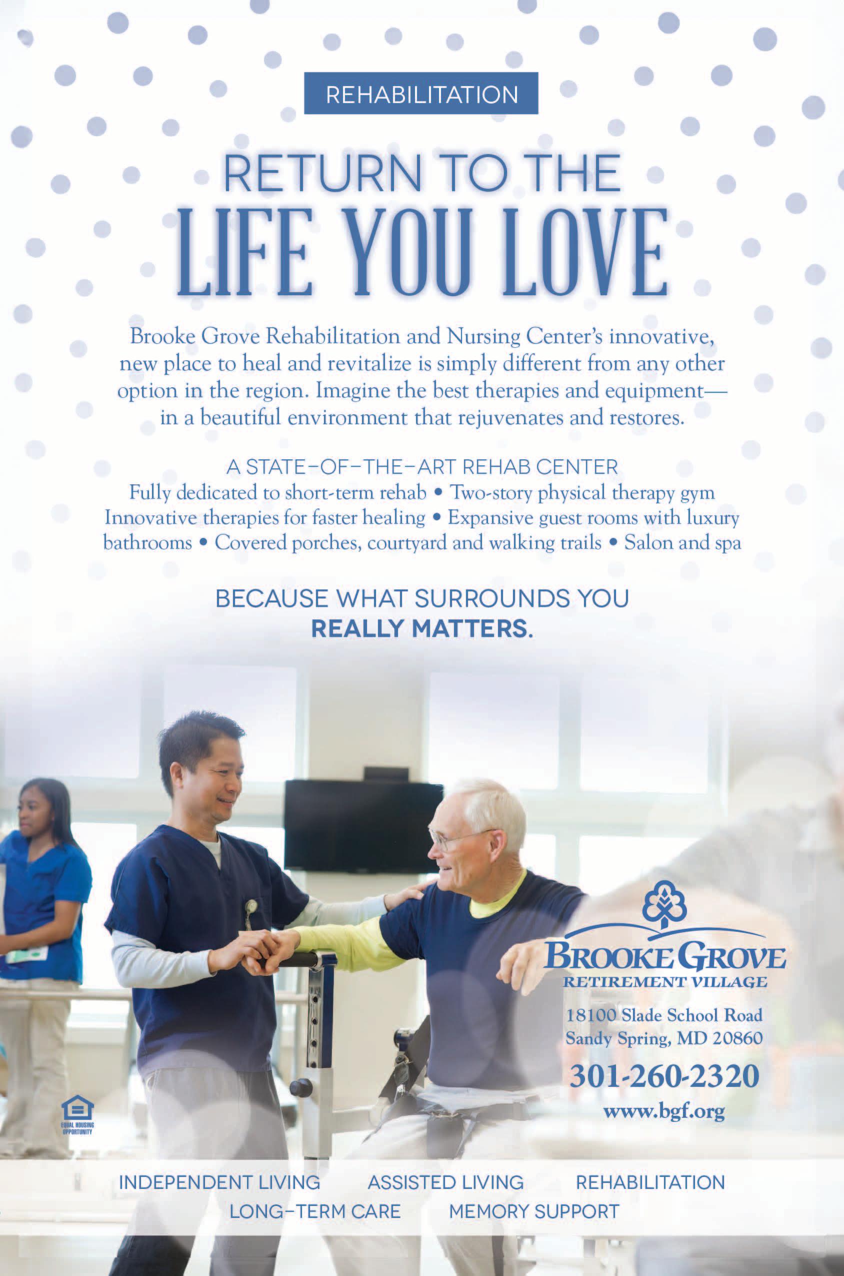 Refresh from the challenges of caregiving or a hospital or rehab stay. Brooke Grove is simply different. 18100 Slade School Rd, Sandy Spring, MD 20860 www.bgf.org See our ads on pages 48, 72.