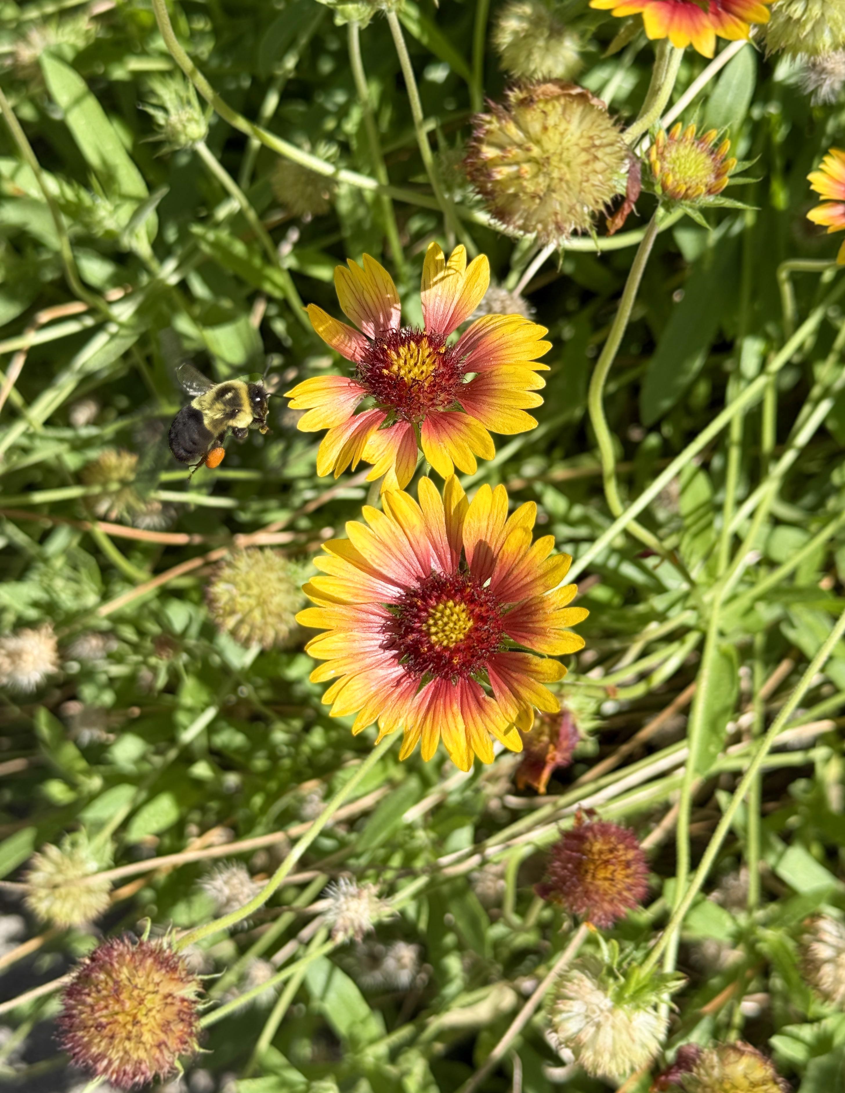 A bumblebee, with full pollen baskets on her legs, visits a bed of Blanket Flowers (Gaillardia) in Nexton Elementary’s pollinator garden.