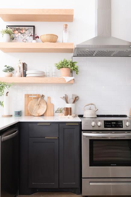 In the kitchen, we chose charcoal gray base cabinets and creamy white uppers. We also selected modern brass pulls to add edge to the traditional Shaker style cabinets and framed the vent hood with floating wood shelves. These shelves are the perfect opportunity for Otwell to display her favorite dishes, framed art and potted plants.