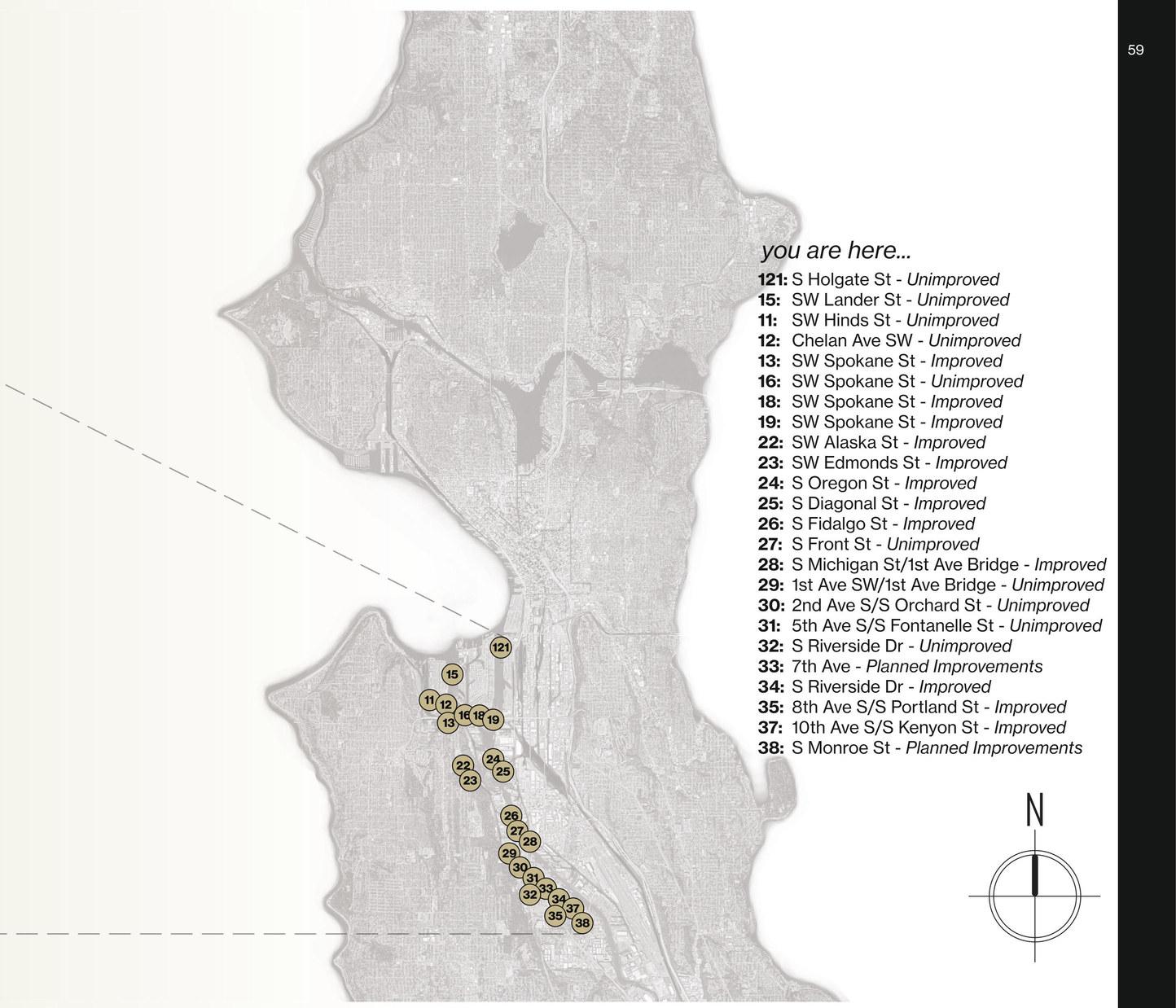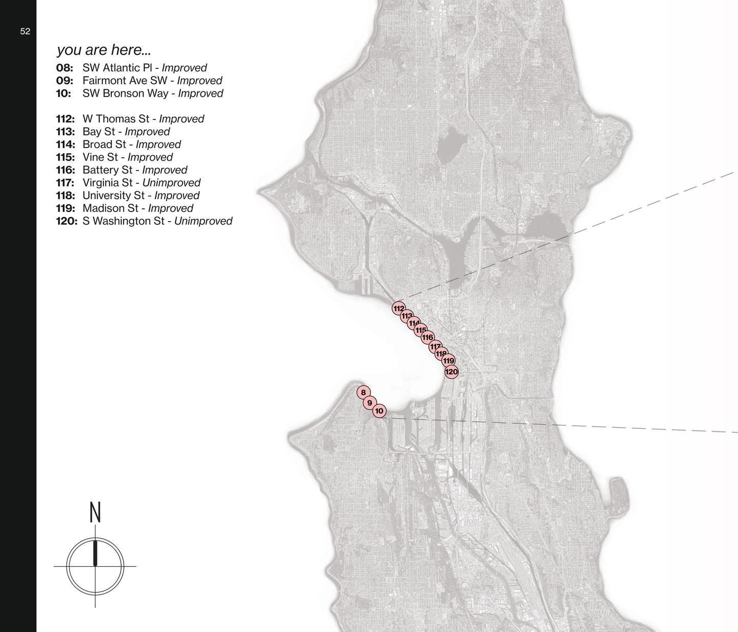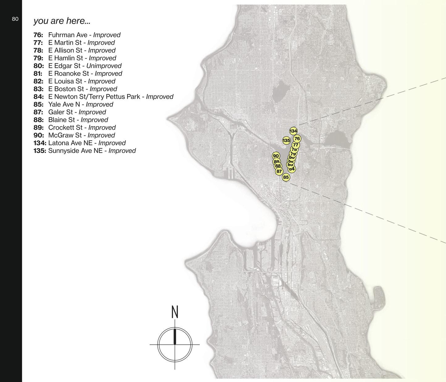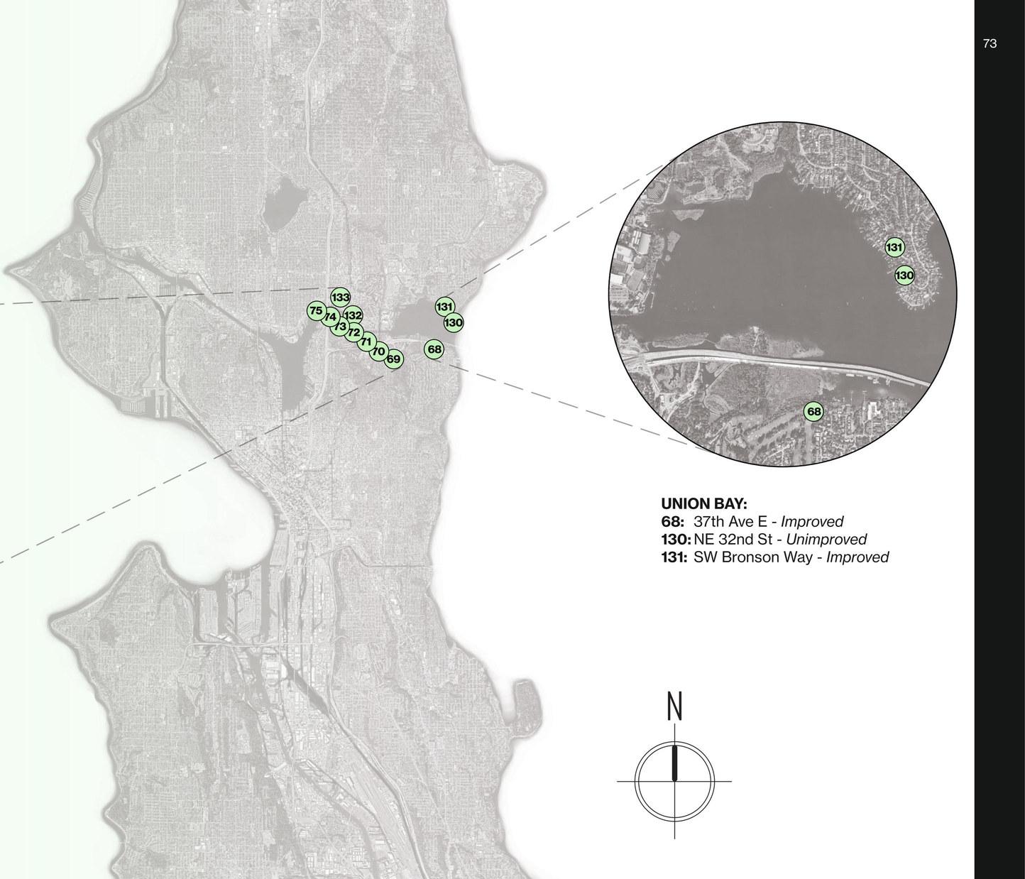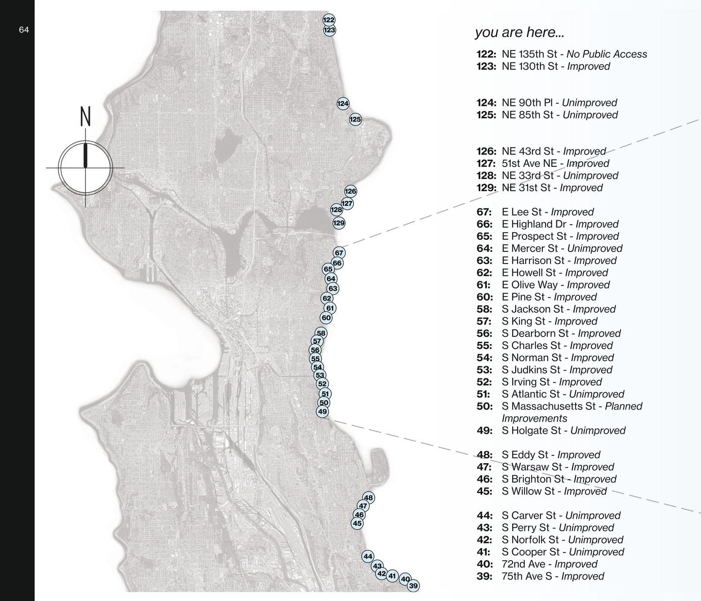 The production and completion of this report could not have been done without the support of the local Seattle community including Omar Akkari and Meredith Grupe of the Seattle Department of Transportation for providing necessary map data and information on the street end program, and Marty and Robin Oppenheimer of Friends of Seattle Street Ends for their input on Seattle’s street end history, which is so long and complex that I barely scratched the surface. I would like to sincerely thank those who took time to answer my questions and meet with me during this process.