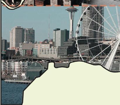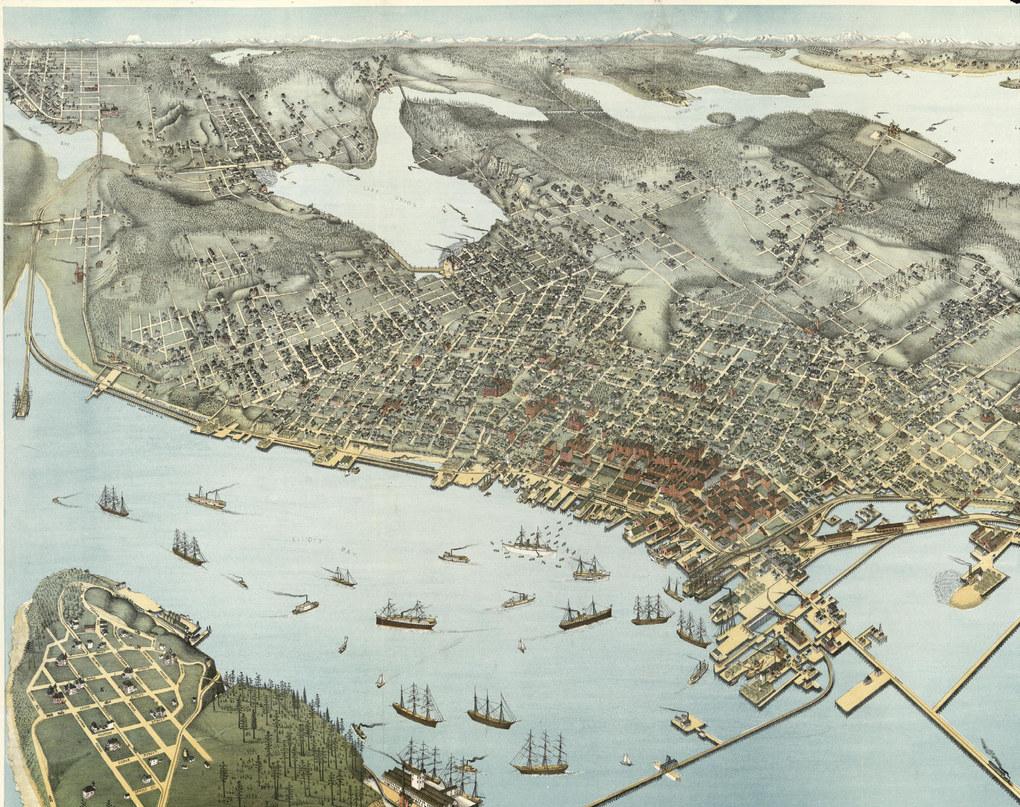 A historic birds-eye view of Seattle created in 1891, just after the Great Seattle Fire of 1889 reshaped our city, shows the bustling waterfront economy of Seattle at the turn of the century. Detailed illustrations show buildings, railways, waterfront piers, and ships sailing around the sound and world. The focus on Seattle’s abundant waterfront access was evident. Life on the water carried a different tune in past centuries, but our waterfront is no less important to Seattleites today ... how can we strengthen our city’s soul by forging a stronger connection between land and water?