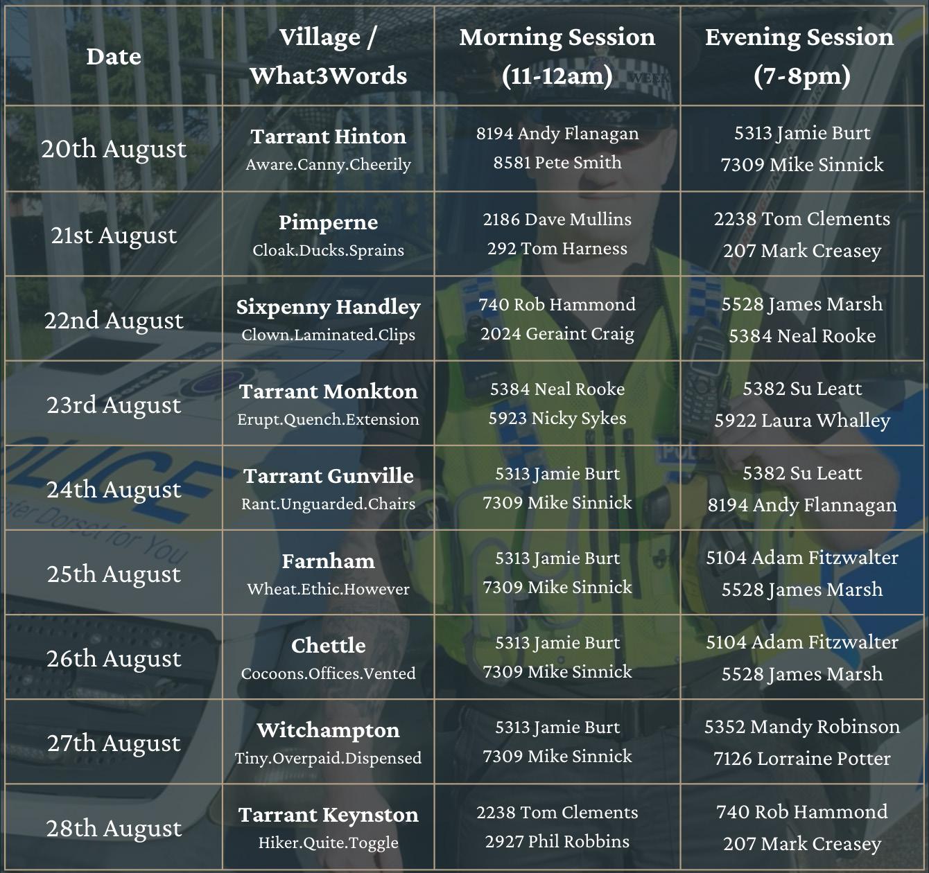 They will be held twice daily from 20th to 28th August 2022 at various locations. You can find more information about each location below or online at https://www.dorset.police.uk/ neighbourhood-policing/north-dorset-rural/ (we use the What3Words app to indicate precise locations). We look forward to seeing you!