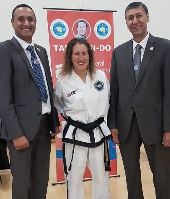 Kim had to travel to Leicester to earn her 7th Dan Master qualification. ‘Over the 30 or so years, I have learned 24 patterns. Of course, you learn the most challenging patterns as a black belt, such as breaking boards or doing a flying sidekick.’