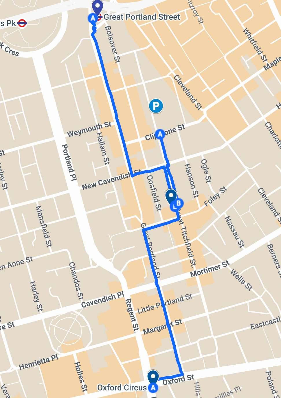 1. Exit the car park onto Clipstone street and turn left onto Great Titchfield Street.