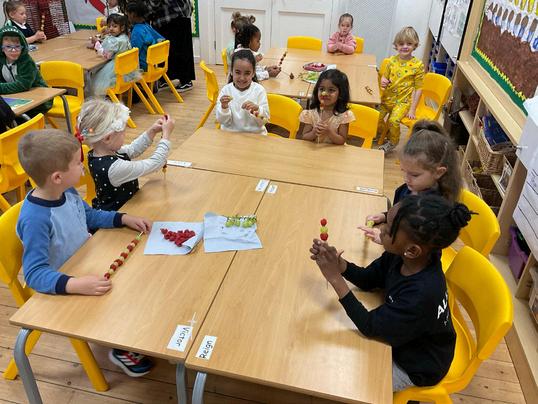 This week in Reception, we transformed into very hungry caterpillars as part of our exciting hands-on learning experience! The children followed stepby-step instructions to create their very own fruit caterpillar skewers using grapes and raspberries Not only was this a delicious activity, but it was also a fantastic opportunity to develop key mathematical skills.