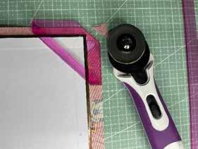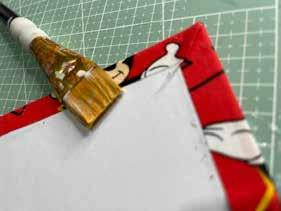 Corte o tecido principal 2x (25x16) e do tecido da lombada 1x (25x6). No comprimento, passe fita dupla face na borda para fazer uma barra, somente de um lado, nos dois tecidos da capa.
