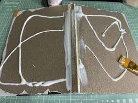 Eu tirei toda a capa decorative e deixei somente no chipboard. Passe cola, espalhe com a ajuda de um pincel. Cole o tecido por cima, começando pelo centro da lombada,