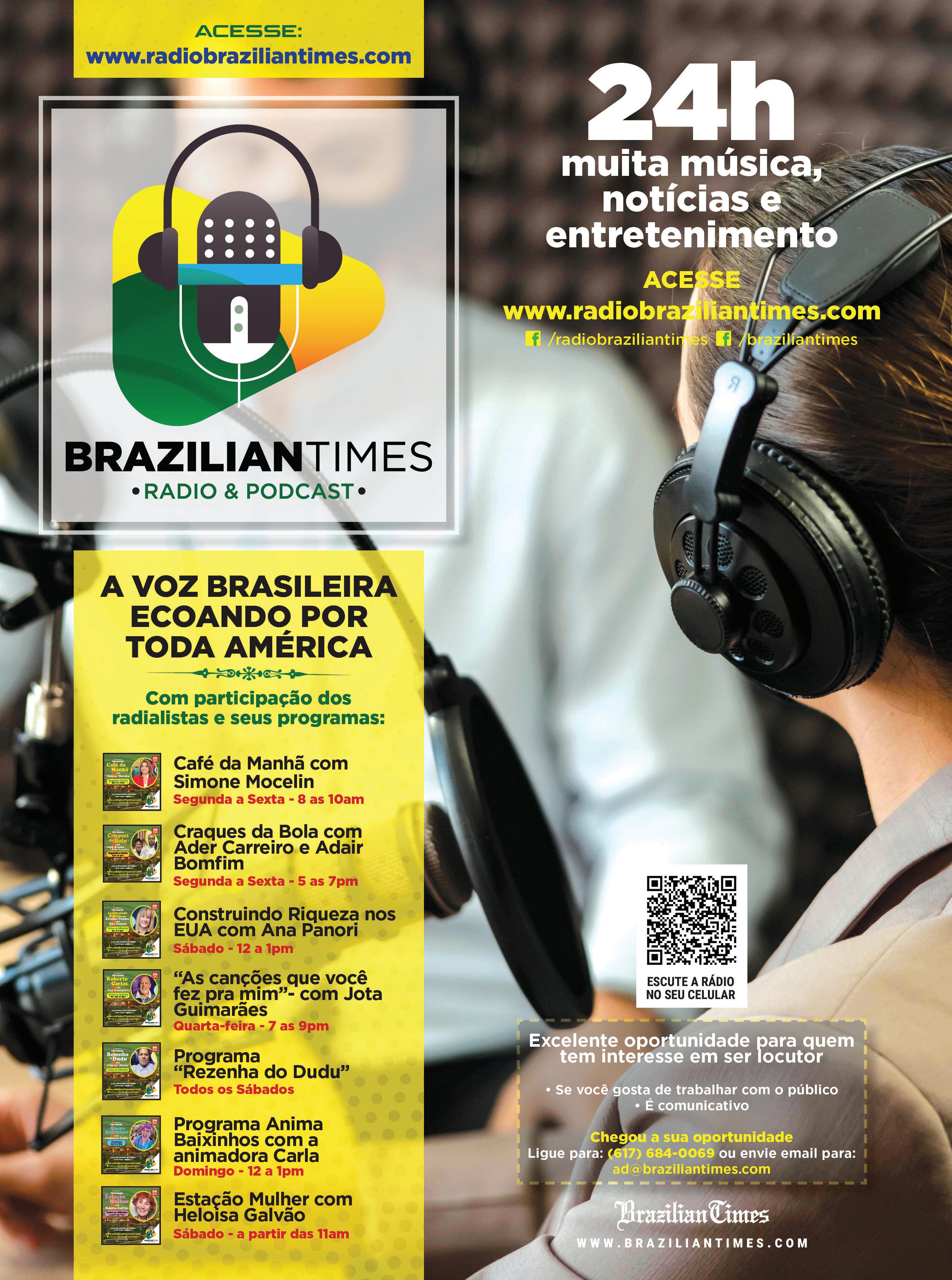 The Best Journal For You! www.braziliantimes.com 19 Advertisement Friday, December 16th of 2022 Quer ter o seu próprio programa Podcast? Nós temos a estrutura para gravar o seu programa em áudio e vídeo! Você poderá alugar por apenas US$50 por hora ESTAMOS LOCALIZADOS NO 311 DA BROADWAY, SOMERVILLE (MA). LIGUE (617) 625-5559 OU (617) 415-3657 Venha conhecer nosso studio!