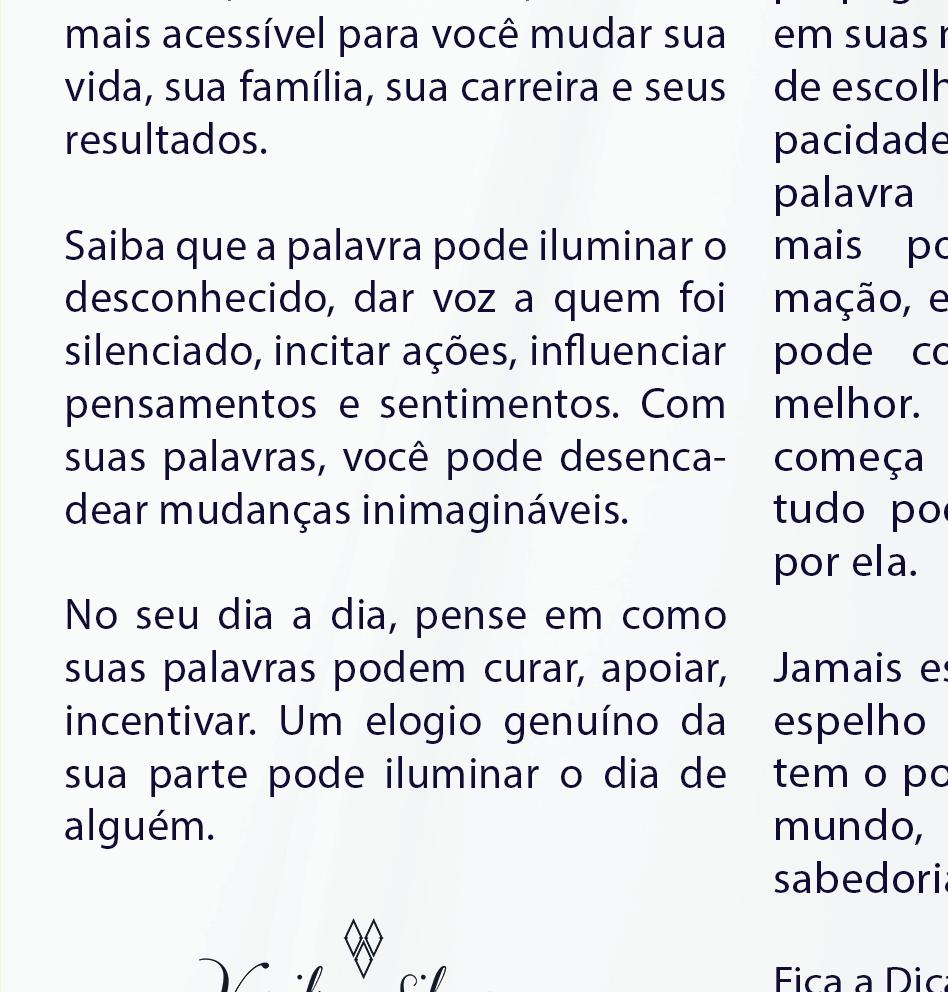 “Acredite em você mesmo, nunca desista dos seus sonhos e tenha sempre uma atitude positiva ante às dificuldades da vida”. Com essas palavras, a taróloga Elza resume o que, em sua opinião, são os pilares básicos para alguém alcançar a felicidade. “Se alguém não acredita em si mesmo, com certeza terá sérios problemas para vencer os obstáculos que a vida apresenta. Por isso, é fundamental ter uma postura positiva, mesmo quando tudo parece que vai desmoronar”.