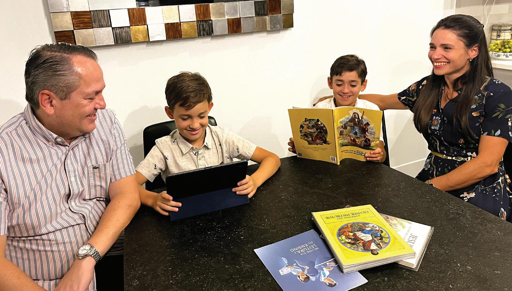 Cézar e Marlene Guimarães melhoram as habilidades de leitura de seus filhos Noah e Nicolas usando o panfleto Melhore Sua Leitura e Seu Ensino, publicado pelas Testemunhas de Jeová – FOTO CORTESIA DAS TESTEMUNHAS DE JEOVÁ