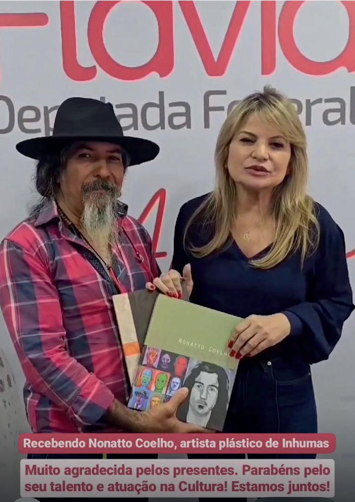 O Artista Plástico e pesquisador cultural Nonatto Coelho, entrega a Deputada Federal por Goiás Flávia Morais(PDT), livros culturais de sua autoria, na ocasião, conversam sobre democratização Cultural em Goiás.