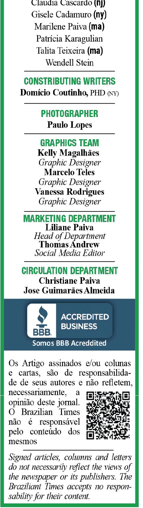 OBrazilian Times é o veículo impresso mais antigo em atividade na comunidade brasileira nos Estados Unidos. Com uma equipe de profissionais ligados à vários assuntos, colunistas que acompanham o que acontece em suas regiões e uma direção voltada a oferecer o melhor para os brasilei-