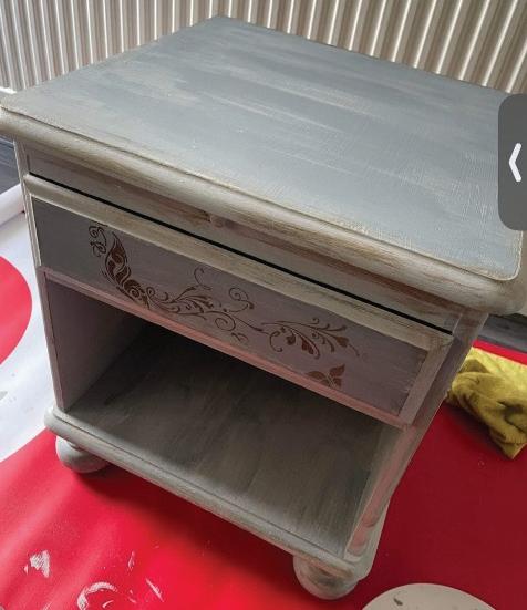 Como eu tinha gaveta, na parte da frente eu deixei ela mais escura, e depois que secou, com uma esponja e a tinta marrom fui dando umas batidas de leve e envelhecendo a peça, claro se você gostar desse trabalho mais vintage. Com um estêncil usei a mesma tinta marrom e a esponja e decorei a frente da gaveta.