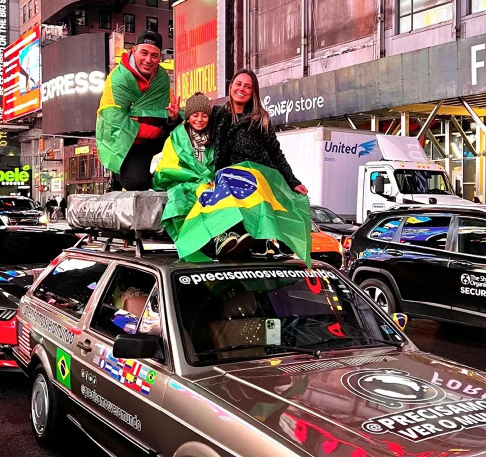 Um vídeo, publicado por eles no Instagram, mostra a família em cima do veículo, segurando a bandeira do Brasil em meio aos painéis luminosos da badalada região nova-iorquina.