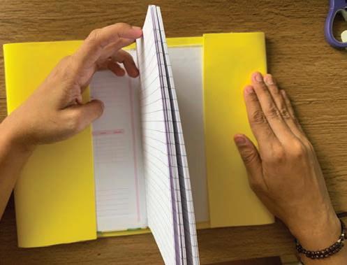 Meça a placa envolta do caderno, deixando 10cm de cada lado para dentro do caderno, cole a parte superior e inferior formando uma cover. Caso a placa seja pequena, corte duas tiras de 10cm pela altura para fazer o encaixe do caderno,