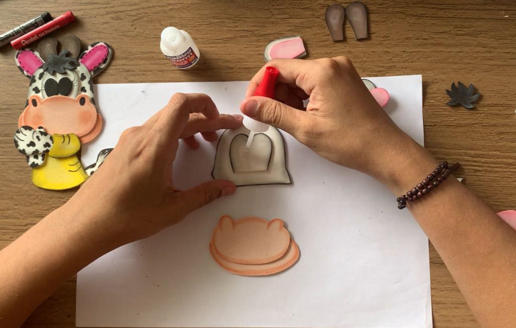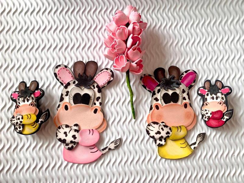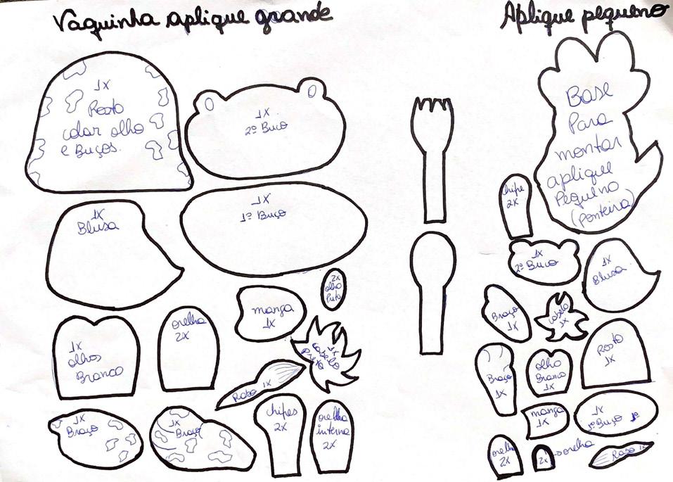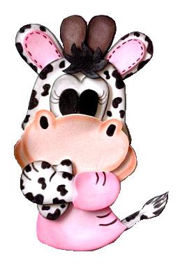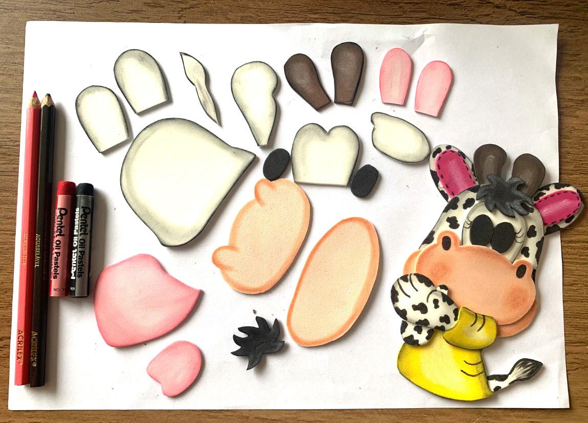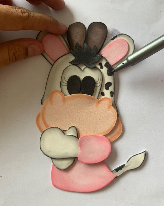 Montar por último a roupa braços e rabo e fazer o detalhe malhado da vaquinha, pode usar lápis aquarelável ou caneta permanente ou retroprojetora, fazer o desenho e preencher dentro de preto. Existe eva malhado, mas optamos por fazer esse detalhe.
