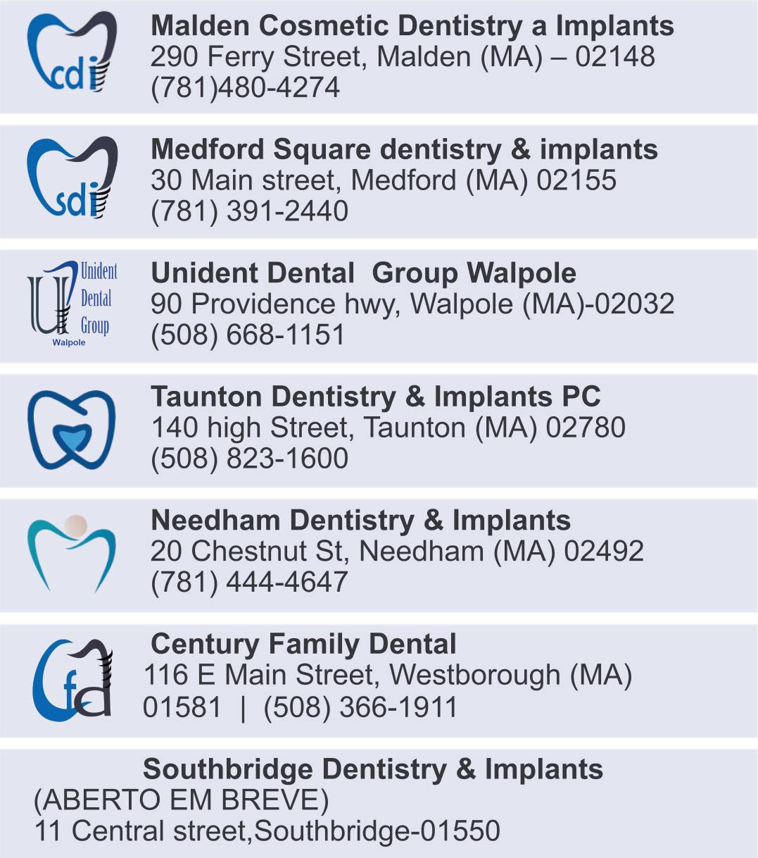 Malden Cosmetic Dentistry a Implants 290 Ferry Street, Malden (MA) – 02148 (781)480-4274 Medford Square dentistry & implants 30 Main street, Medford (MA) 02155 (781) 391-2440 Unident Dental Group Walpole 90 Providence hwy, Walpole (MA)-02032 (508) 668-1151 Taunton Dentistry & Implants PC T 140 high Street, Taunton (MA) 02780 T (508) 823-1600