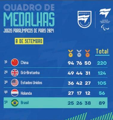 Nesta segunda, dia 9, os últimos atletas brasileiros deixaram a Vila Paralímpica de Paris, para retornar ao Brasil em três voos. Eram competidores de vôlei sentado, esgrima em cadeira de rodas, tênis em cadeira de rodas, futebol de cegos, judô, ciclismo, atletismo e natação. Paris representou uma chuva de recordes para a delegação verde e amarela, que fechou sua participação com 89 medalhas, sendo 25 ouros, 26 pratas e 38 bronzes, obtendo pela primeira vez o quinto luar no quadro de medalhas. Outra importante marca estabelecida foi a de 25 primeiros lugares, três a mais que as 22 de Tóquio-2020. Na capital francesa, esse número de ouros do Brasil ficou atrás de China (94), Reino Unido (49), Estados Unidos (36) e Holanda (27). Além disso, no total de pódios, só superaram os 89 do Brasil: China (220), Grã-Bretanha (124) e Estados Unidos (105). Quarta no quadro, com 27 ouros, a Holanda, porém, somou 56 premiações no total.