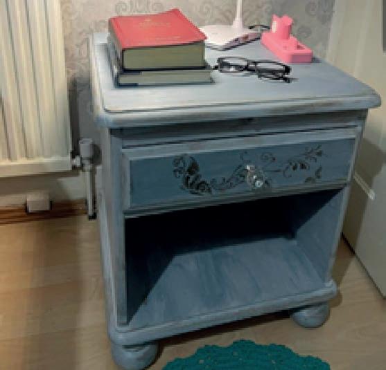 Como eu tinha gaveta, na parte da frente eu deixei ela mais escura, e depois que secou, com uma esponja e a tinta marrom fui dando umas batitas de leve e envelhecendo a peça, claro se voce gostar desse trabalho mais vintage. Com um stencil usei a mesma tinta marro,m e a esponja e decorei a frente da gaveta.