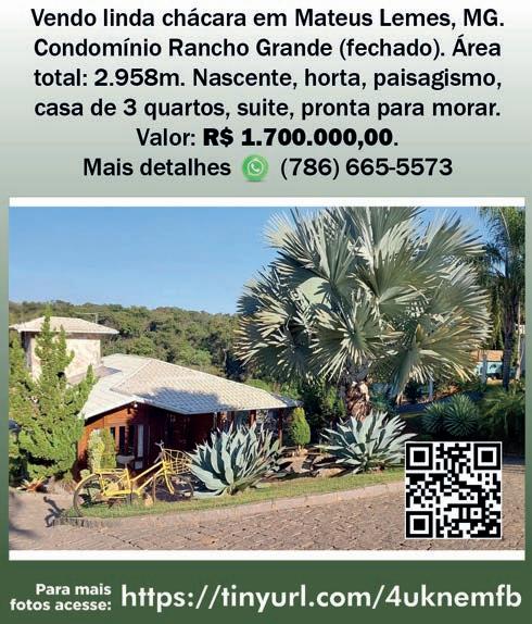 Vendo linda chácara em Mateus Lemes, MG. Condomínio Rancho Grande (fechado). Área total: 2.958m. Nascente, horta, paisagismo, casa de 3 quartos, suite, pronta para morar. Valor: R$ 1.700.000,00. Mais detalhes por whatsapp: (786) 665-5573 link de fotos: https://www.dropbox.com/scl/ fo/0yegmt4juos7l2599wy1a/ AHrIRokcOCZ8w759VteARhk?rlkey=64n81y3hsag9ifwqou82ckv42&st=0if1olwh&dl=0 #H
