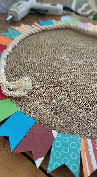 Corte bandeirinhas de papel, eu usei furador, mas você pode cortar em máquinas de corte ou mesmo a mão. Com cerca de 2,5”, umas 30 unidades, com a cola quente vá colando as bandeirinhas na base do seu Supla, alternando as cores. Você pode alterar o papel por embalagens de papelão.