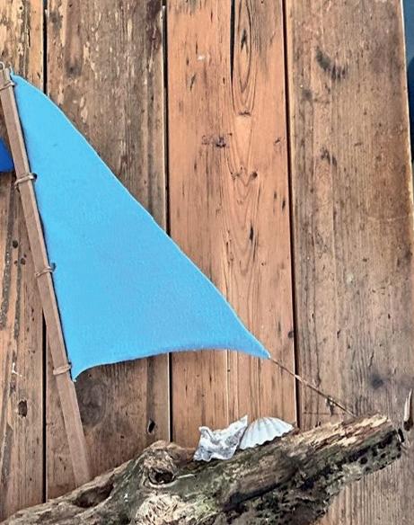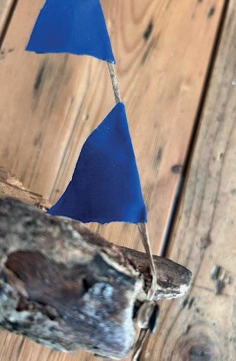 Para a vela do outro lado, corte um feltro com cerca de 25 cm em formatro de triangulo. Faça 4 fuos em um dos lados, coloque pedacos de sisal com cerca de 5cm e marre no mastro. Na outra ponta oposta aos furos cole um pedaço de sisal na ponta para fixação no troconcom, com cerca de 12cm.