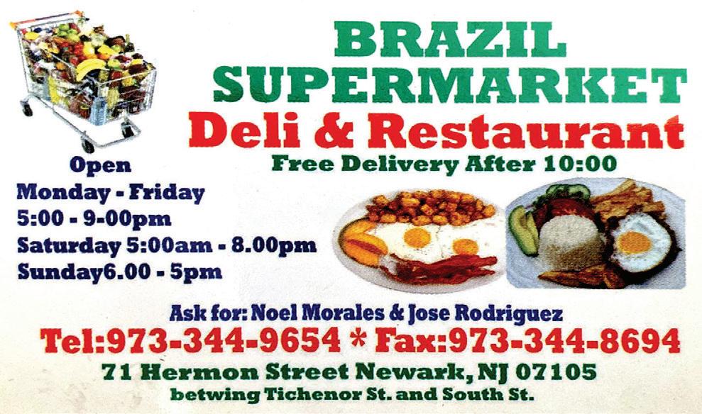 VARIETY 107 Gramatan Avenue Mount Vernon NY TEL: (914) 667-5447 @bradelimountvernon bradeli@msn.com REAL BRAZILIAN BBQ Bar & Charcoal Grill 145 GRAMATAN AVE. MT VERNON, NY 10550 Entrega gratuíta após as 10 AM. Mínimo $10 de compra aceitamos • SUPERMERCADO • PADARIA • RESTAURANTE 71 Herman St. Newark, NJ 07105 Phone: 973.344.9654 EMPREGO NEW YORK In God We Trust aberto todos os dias das 6am as 8pm • Salgados • Pratos Tradicionais • Sucos Naturais • Sanduíches • Bolos e Sobremesas • 973-878-2222 FAZEMOS EntrEgAS!