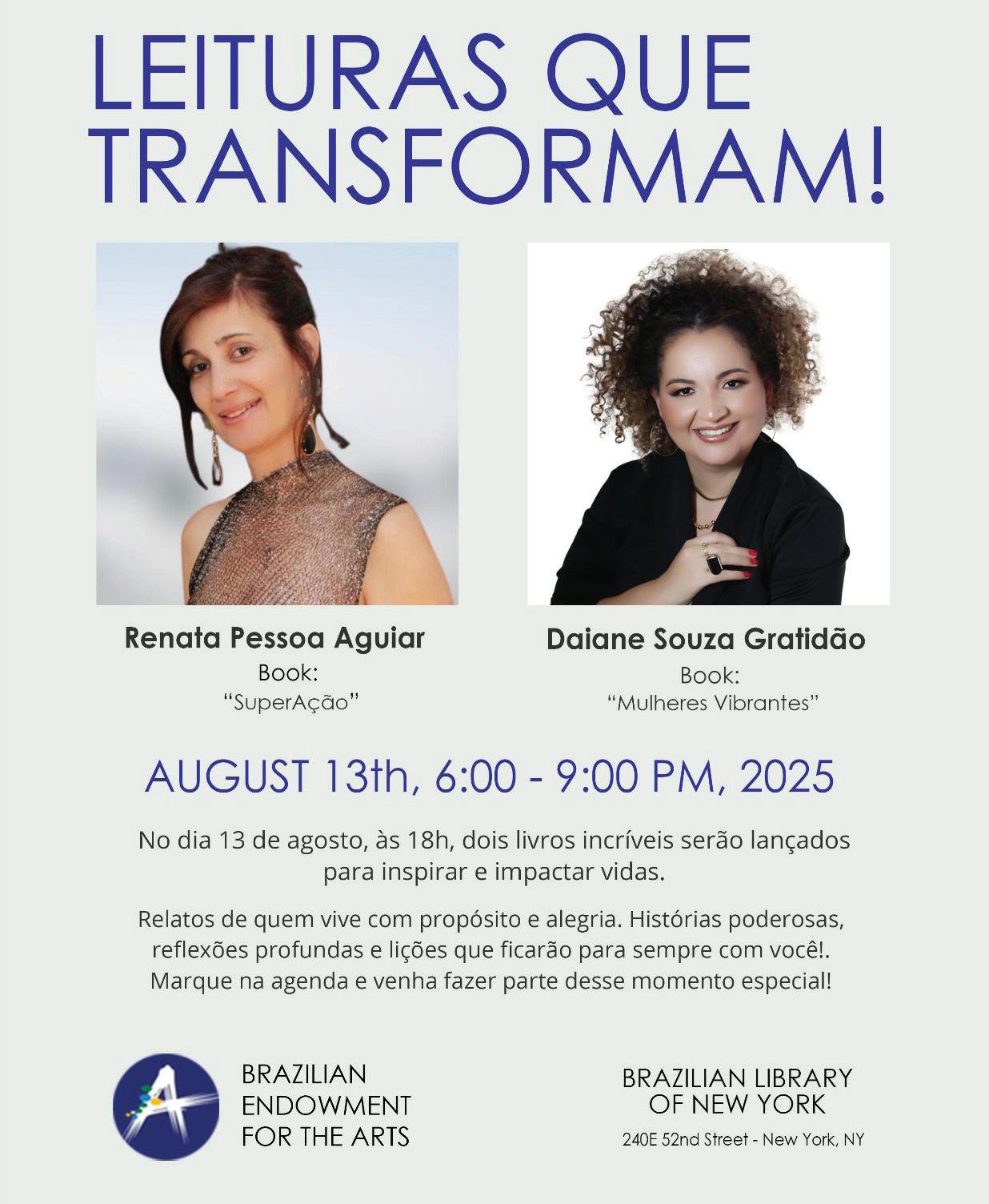 Aliteratura brasileira ganha espaço em Manhattan com o lançamento de dois livros que prometem tocar corações e transformar vidas. No dia 13 de agosto de 2025, das 18h às 21h, a Brazilian Library of NY sediará o evento “Leituras que Transformam!”, reunindo duas autoras que compartilham histórias de superação, propósito e alegria.