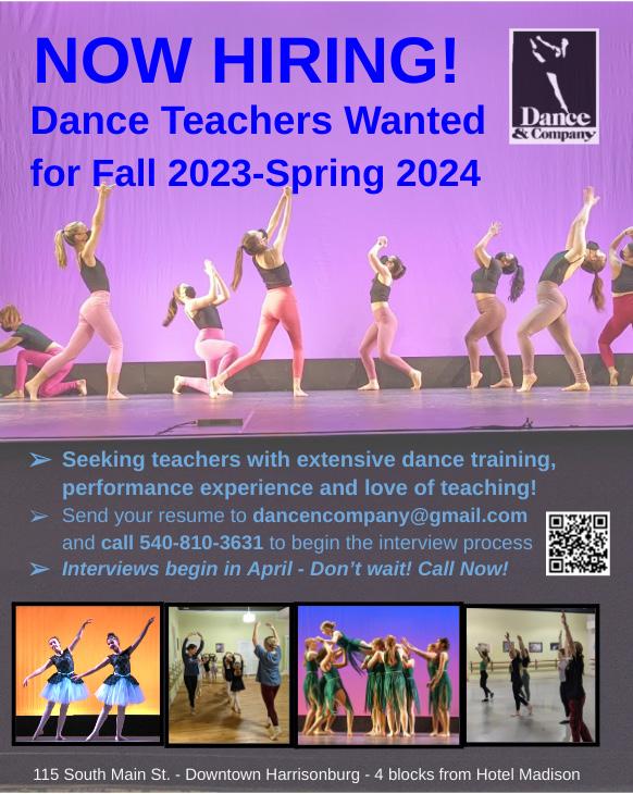 NOW HIRING Dance Teachers for Fall 2023-Spring 2024 at well-established studio in downtown Harrisonburg. Seeking teachers with extensive dance training, performance experience and love of teaching! Send resume to dancencompany@gmail.com and call 540810-3631 to begin the interview process. Interviews begin in April-Call Now! More info - dancenco.com/ employment-opportunities.