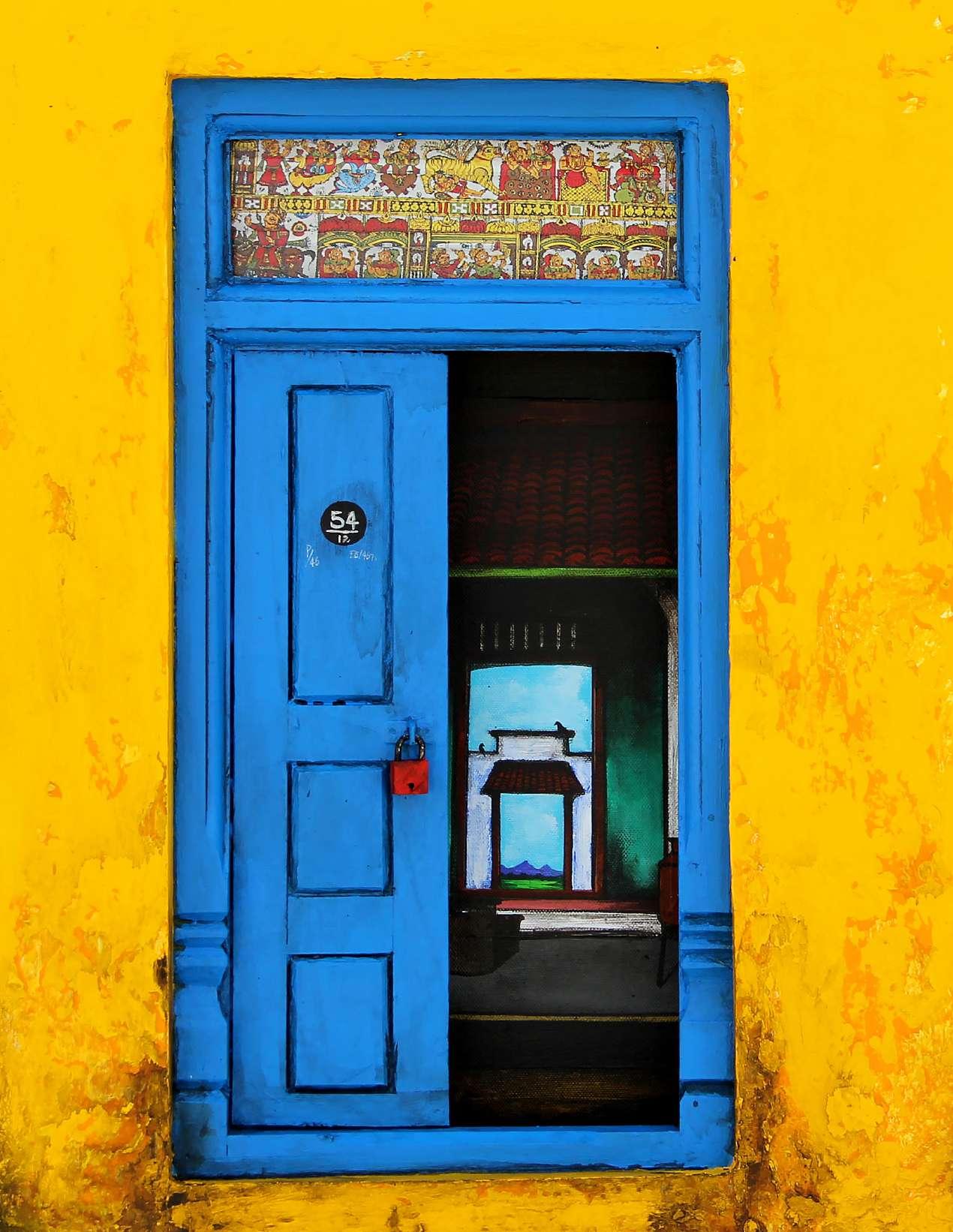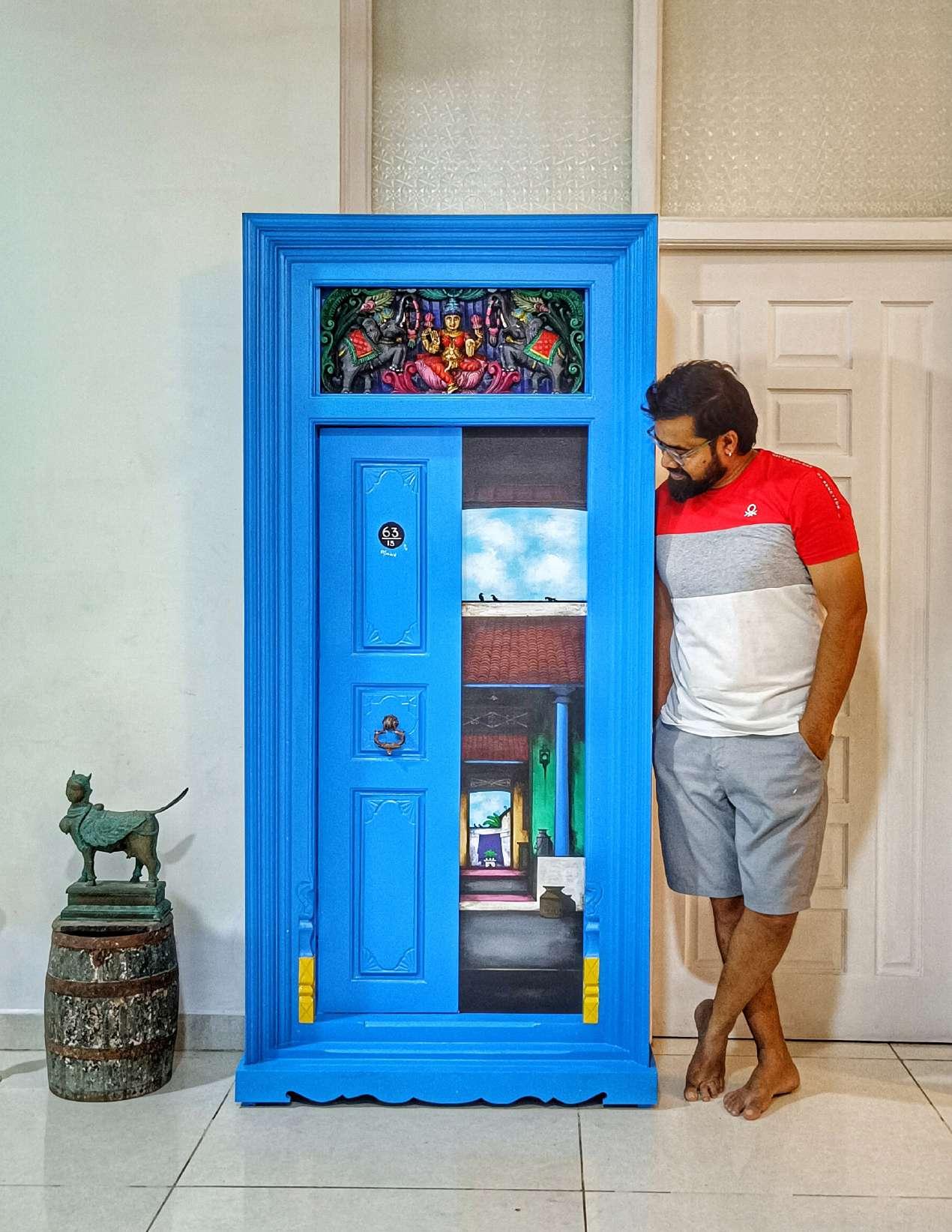 I feel colours give a jolt of freshness and joy in our ordinary life. The modern doors which are usually in shades of brown and black, bring a feeling of dullness. Every city has a different popular choice of colour for its doors. For example, Madurai has prominent greens, Tirunelveli has blue hued doors and chettinad houses are filled with yellow colours. These vibrant colours tell their own stories of origin and weave a tale for the onlookers. My muse is not just the doors of my hometown but of every different city. I take it up as my passion to visit different cities and create paintings inspired by the doors in the location. One time, the president of Mauritius, who was of Indian origin, loved my Bhojpuri styled door and bought it on the spot as it was from his hometown and brought so many memories for him. These instances make me want to explore more and create more such paintings.