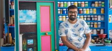There is a saying that, “Eyes are the windows to the soul”, but to one person inspiration came in the form of doors. Every closed door that he passed by, piqued his interest to imagine the lives that lay beyond them. What started as a small fascination later on became his passion and career into painting intricate half open doors with a little peek into tales that beheld them. Santhana Krishnan is now an internationally acclaimed artist whose lively doors have reached the homes of many celebrities from Sachin Tendulkar to Kamal Hassan. He is proud to have picked a muse which has a different tale every time he picks up his brush. Let us hear more from the man of many doors himself.