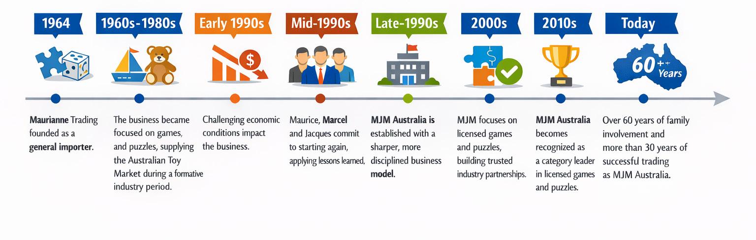 The story begins with the incorporation of Maurianne Trading in 1964 as a general importer in Australia. Built on entrepreneurial drive and strong customer relationships, the business evolved through the late 1960s and into the 1970s, with an increasing focus on games and puzzles, establishing its enduring connection to play.