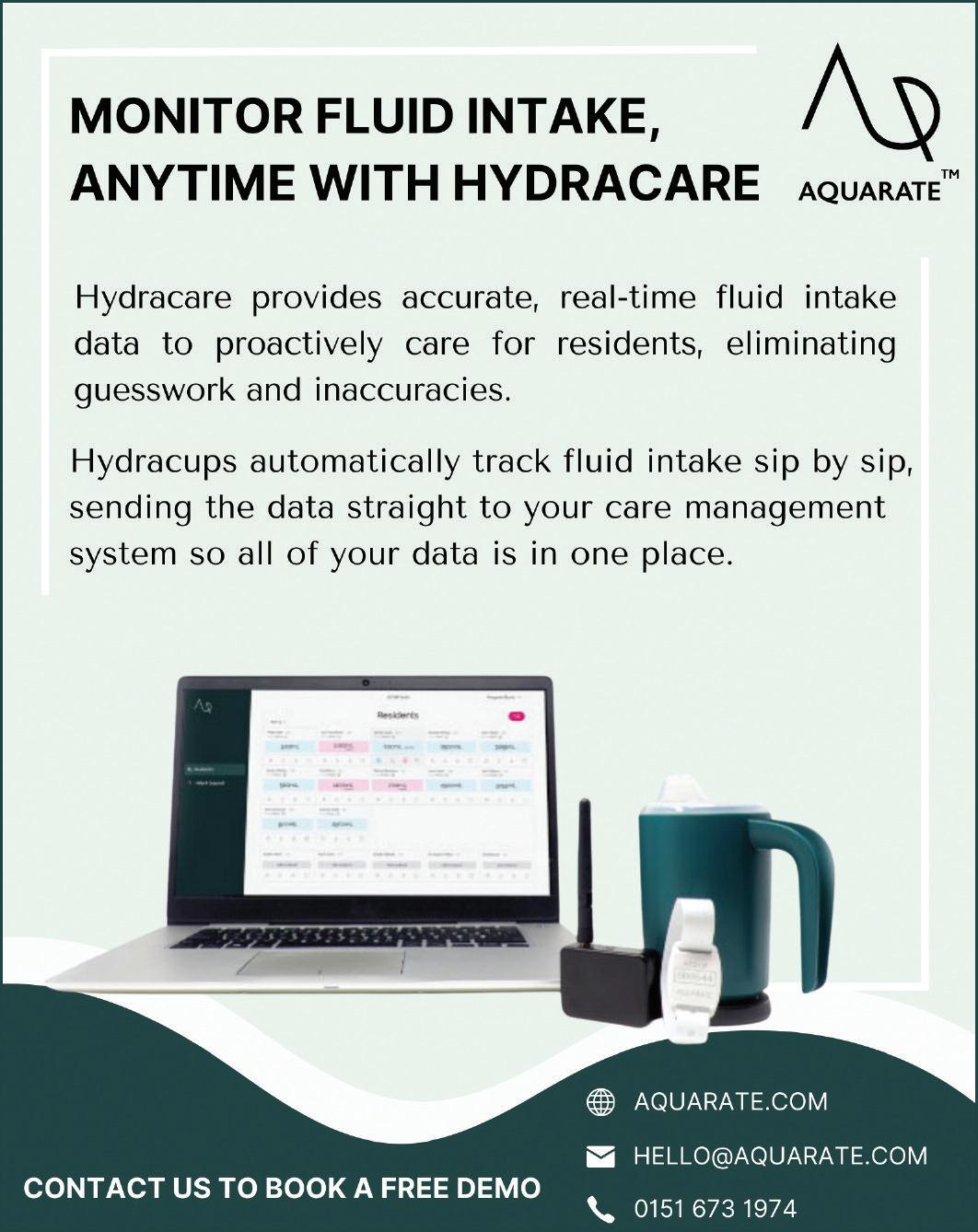 PRODUCTS AND SERVICES PAGE 42 | THE CARER | MAY/JUN 2023 Aquarate have developed Hydracare- an automated fluid monitoring system that tracks how much an individual drinks using their Hydracup Hydracup is the only smart cup on the market which can produce accurate data that integrates into care systems, saving staff time, and delivering quality care The Hydracup discreetly tracks an individual’s fluid intake by measuring liquid volume automatically, allowing caregivers to proactively support further fluids to those who need it the most Hydracare technology ensures accurate automated fluid monitoring to reduce incidences of dehydration and patient safety issues increasing quality of care HYDRACARE BENEFITS 24/7 accurate real-time fluid intake data for carers • Intelligent remote monitoring, reducing time for staff to record Reduced patient safety issues Supports independent living for longer • Fluid intake history to help keep track of the past Restricted fluid management to help limit consumption Works with hot and cold drinks • Commercial dishwasher safe for quick and easy cleaning Up to 5 day battery life with low battery indicator Spill detection with immediate alerts so you can react fast Get n contact to book a free demo Hydracare Technology starts at as little as 40p per resident per day Let s look after our loved ones! Visit www aquarate com or see page 7