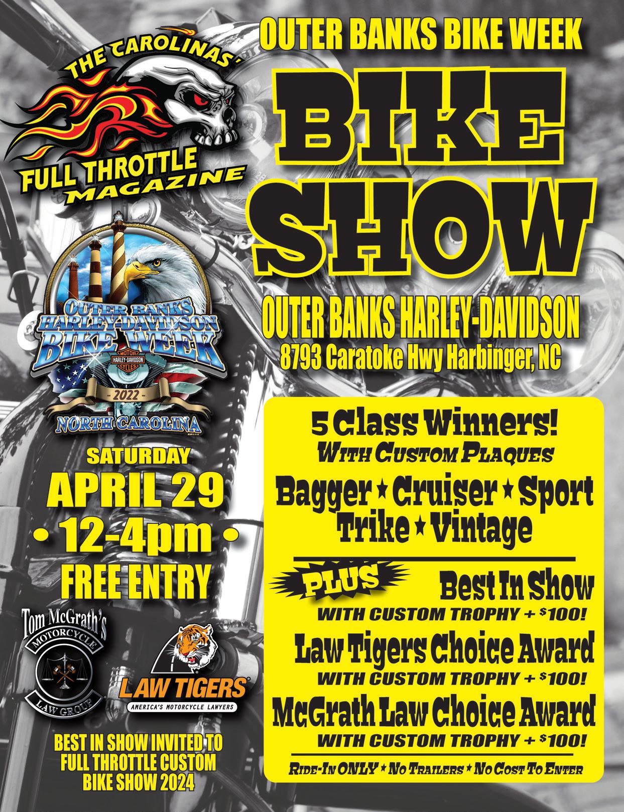 . There are also two Carolinas’ Full Throttle Magazine BIKE SHOWS in April! April 15th at Bulldog Harley-Davidson’s 1st Anniversary Party in Smithfield, NC and April 29th at Outer Banks HarleyDavidson during OBX Bike Week. Both are FREE shows, and you can win cash and trophies. Best In Show from these bike shows will be invited to The Carolinas’ Full Throttle Magazine Custom Bike