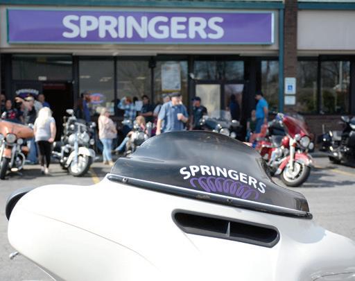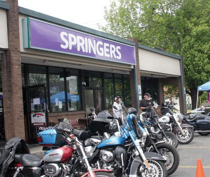 t SpringerS Bar, it’S common place to See a parking lot full of motorcycles. The “front porch” is lined with tables and chairs and on any given night, those chairs are full of bikers sittin’ around telling tales and cuttin’ up. Springers owner Jeff Schmid knows what bikers like, cause he’s a fellow rider. Every so often Jeff pulls out the smoker or the grill and makes the parking lot even more inviting as he cooks up delicious eats for his patrons. On Tuesday nights, its bike night at Springers, and while bike nights go on year round, during the warmer seasons, bike night brings vendors, cash prizes, live music and push capacity of the parking lot. Inside Springers, capacity is no problem. A U-shaped bar sits on the right side of the building and can put 18 folks belly up to the bar. There is a HUGE dance floor area that also features tables and more seats. There is also ample room for the pool tables and then an entirely separate room for indoor cornhole play. Springers regularly features live music and brings in a ton of great local bands.