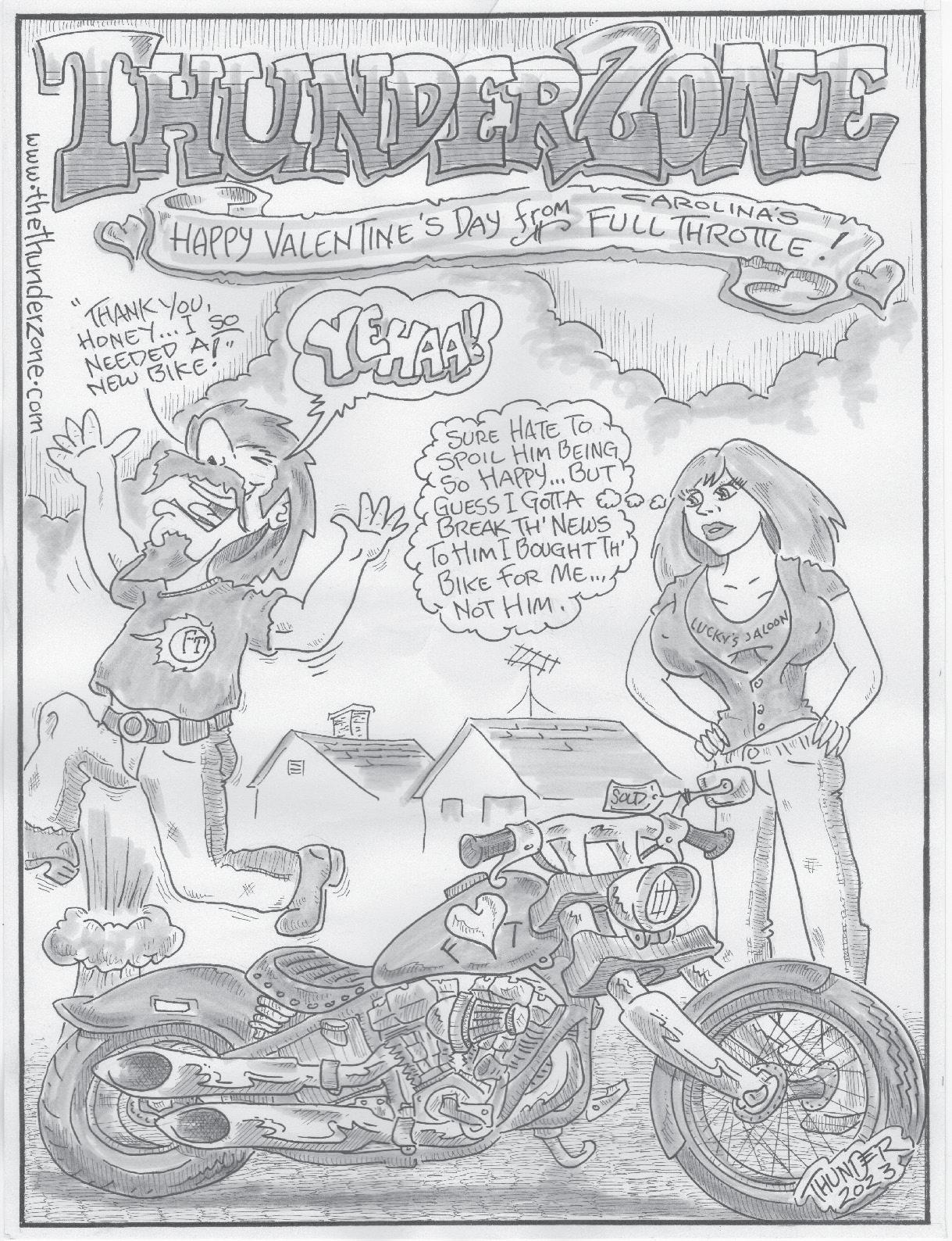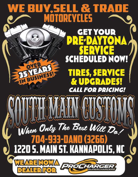 ho’s ready to go racin’? check out Paul Watson’s Lumbee Racing and the All Harley World Shootout on the cover of this magazine and on pages 4-5. If you are looking for a great all around event with drag racing, mini bike drag racing, vendors, music and a ton of fun then you gotta go to the All Harley World Shootout! Speaking of this cover, did ya notice that we are at another milestone with the Carolinas’ Full Throttle Magazine?! Last month we entered our 25th year in print and this month is our 250th issue. Now, 295 doesn’t seem like a big number unless you are talking months! 295 months dates all the way back to August of 1998, before Mom, Maggie or I had any grey hair! We haven’t missed a step in 295 months, in fact, we’ve only gotten better with age. January 14th we pulled off our biggest event to date with the Carolinas’ Full Throttle Magazine Custom Bike Show at the Greensboro Coliseum. If you were there, you know it was a big time, if you missed it, check out the article in this issue and catch up! The Bike Show is history now…History that is recorded in this 295th issue of the Carolinas’ Full Throttle Magazine, cause that’s what we do…Record the history of motorcycling in the Carolinas! If you are looking to get in on this game, give us a shout, we need sales reps and event coverage all over the Carolinas and we can certainly point you toward some work! While you are looking through the magazine make sure you hit up the Cruisin’ Calendar for events and check out the advertisers in this issue for all the deals you need to keep you on the road. We have one hell of a motorcycle community in the Carolinas! We will see ya out there!
