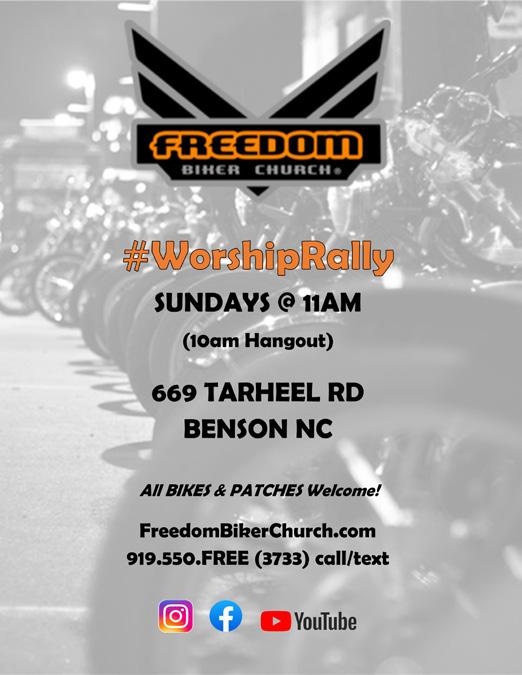 APR 1 11TH ANNUAL THE SANDHILLS NC BIKE BLESSING Freedom Biker Church-Fayetteville, 455 Rock Hill Rd., Fayetteville, NC. 11am-2pm, food, door prizes, bike blessings, music, event tee, vendors, grand prize drawing @2pm. www.freedombikerchurchfayetteville.com