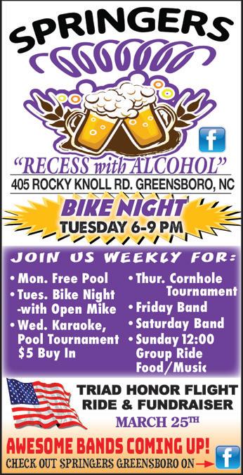 MAR 25 TRIAD HONOR FLIGHT FUND RAISER Springer’s, 405 Rocky Knoll Rd., Greensboro, NC. KSU 12pm, $20/ bike, $10/passenger, live music, food, gun raffle.