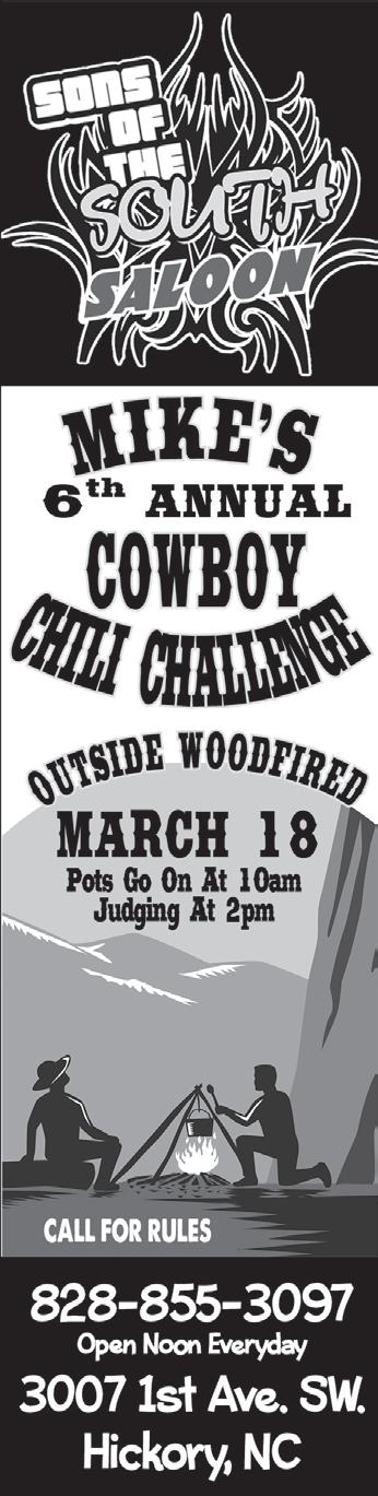 MAR 18 MIKE’S 6TH ANNUAL COWBOY CHILI CHALLENGE Sons Of The South Saloon, 3007 1st Ave. SW., Hickory, NC. Pots go on at 10am, judging at 2pm, $30/ pot entry, pre-reg required, cash prize, one free shirt per entry. Proceeds go to local charities. Call for rules, 828-8553097 or 828-327-8555.