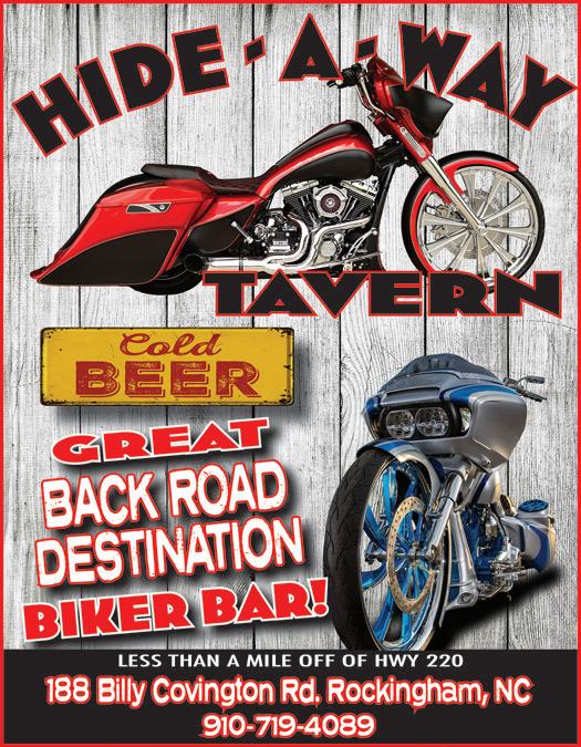 APR 15 2nd ANNUAL HELPING US HELP RIDE-N-RALLY The Wizard Saloon, 651 21st St. NE, Hickory, NC. Ride Reg 9am, last bike in 1pm, $20/single, $30/couples, 17 & under free. Rally gates open 12pm. Food, live music, vendors, door prizes, 50/50, bike games, raffle tickets, people’s choice bike show, camping. Ivan West, 704-957-1157 or Homie, 828-217-4218