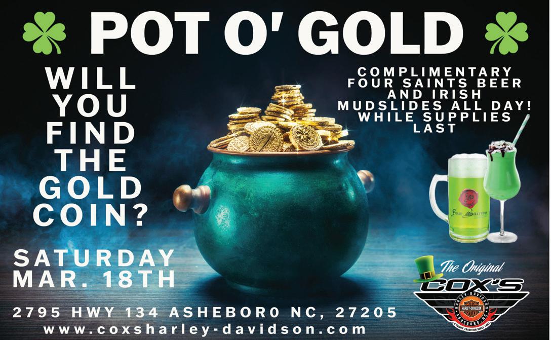 MAR 18 COX’S HARLEY-DAVIDSON OF ASHEBORO POT O’ GOLD 2795 Hwy 134, Asheboro, NC. 11am-7pm, complimentary beer & Irish Mudslides while supplies last. www.coxsharleydavidson.com, 336-629-2415