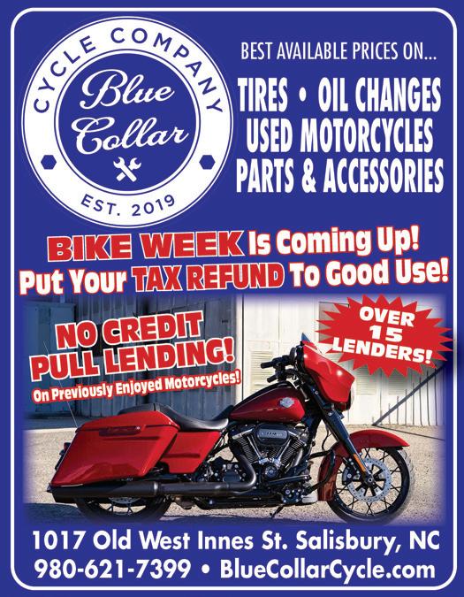 APR 13 BLUE COLLAR CYCLE COMPANY BIKE NIGHT 1017 Old W. Innes St., Salisbury, NC. 6pm, music, best bike prize, food & drink avail. www.bluecollarcycle.com, 980-621-7399