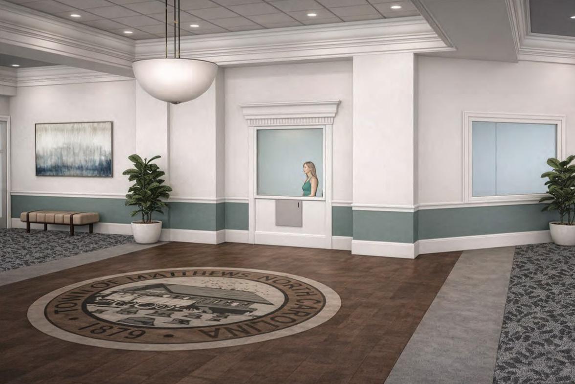 TMT Construction provided this rendering to the Town of Matthews showing how the front desk at town hall could go behind glass. Included in the project is reflooring of the lobby that includes the Matthews seal. Photo courtesy of Town of Matthews
