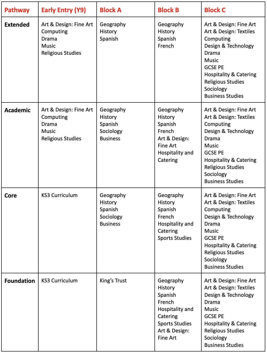Key Stage 5 course options: