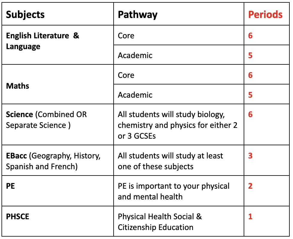 All students in year 10 and 11 will study these subjects