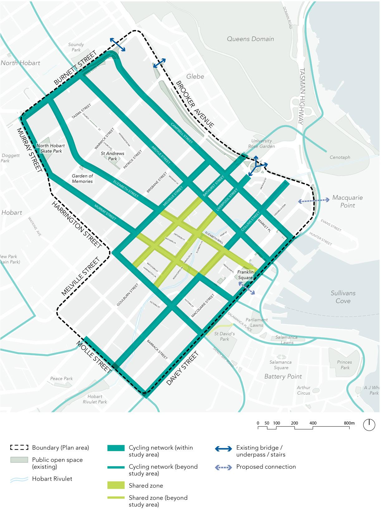 The Plan provides for streetscape upgrades for better movement, and improved amenity and street vibrancy. It recognises the key connections between a range of public transport modes, addresses more efficient car parking, and aims for greater pedestrian focus in Central Hobart (see section 3.5).