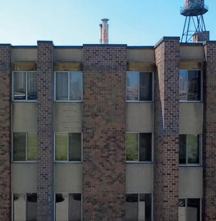 IS A MULTI-STORY BRICK BUILDING CHARACTERIZED BY REPETITIVE VERTICAL BAYS AND STRUCTURAL BRICK PILASTERS ACROSS ALL FAÇADES. ITS ROBUST INDUSTRIAL CHARACTER, GENEROUS FLOORPLATES, AND LARGE WINDOWS REFLECT ITS ORIGINAL PROGRAM OF CARE AND RESIDENTIAL SUPPORT. AS ONE OF THE MOST ARCHITECTURALLY DEFINED STRUCTURES ON THE BLOCK.
