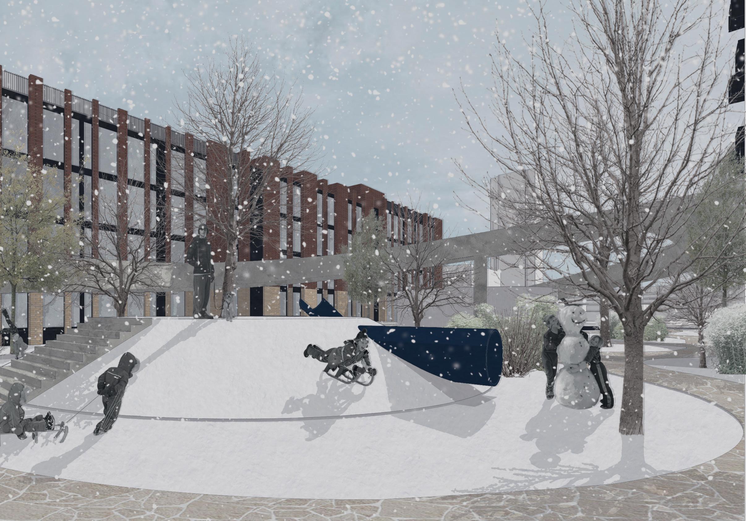 IN WINTER, THE SAME STRUCTURES ARE REPURPOSED. THE INSTALLATIONS TRANSFORM INTO SLEDDING AND TUBING RAMPS, ADAPTING THE PLAY DYNAMICS FOR EXTREME WEATHER AND ENSURING THE CIRCULAR AREA REMAINS A VIBRANT HUB FOR FUN AND PHYSICAL ACTIVITY. THE ENTIRE AREA IS COVERED IN SNOW, ENCOURAGING A UNIQUE FORM OF WINTER PLAY.