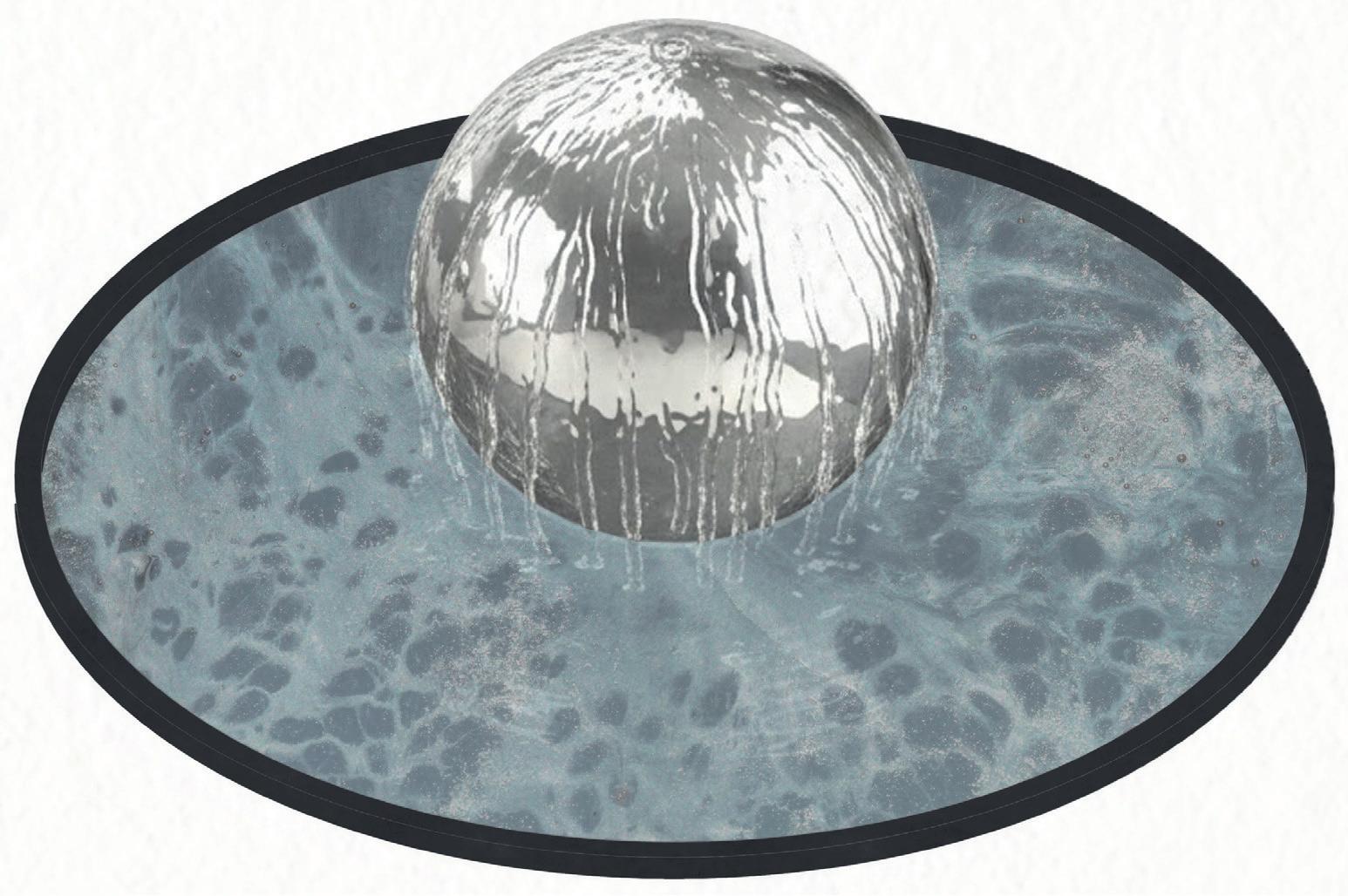 THIS AREA FEATURES A LARGE SPHERICAL SCULPTURE THAT FUNCTIONS AS A DYNAMIC WATER FOUNTAIN. WATER FLOWS CONTINUOUSLY OVER THE HIGHLY REFLECTIVE METAL SURFACE AND INTO THE SURROUNDING BASIN, CREATING A VISUAL AND AUDITORY FOCAL POINT THAT WELCOMES VISITORS.